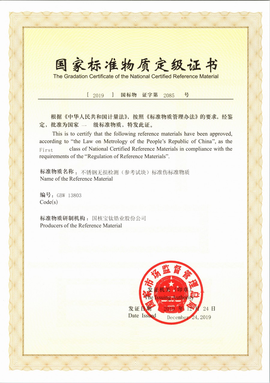 近日,國核鋯業取得了由國家市場監督管理總局頒發的“鈦和不銹鋼無損檢測(參考試塊)標準傷標準物質”兩項國家一級標準物質定級證書。國家一級標準物質資質在全國范圍內僅授權國核鋯業,標志著公司無損檢測人工傷制備技術代表了國家能力,達到了國內最高水平。
