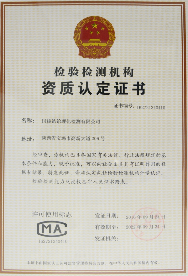 國核鋯業(yè)所屬國核鋯鉿理化檢測有限公司檢驗(yàn)檢測機(jī)構(gòu)資質(zhì)認(rèn)定證書